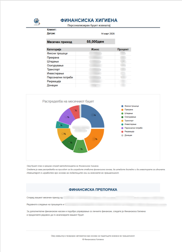 Извештајот содржи преглед на вашите месечни приходи, распределба на трошоците, визуелен график за буџетот и персонализирани финансиски препораки.