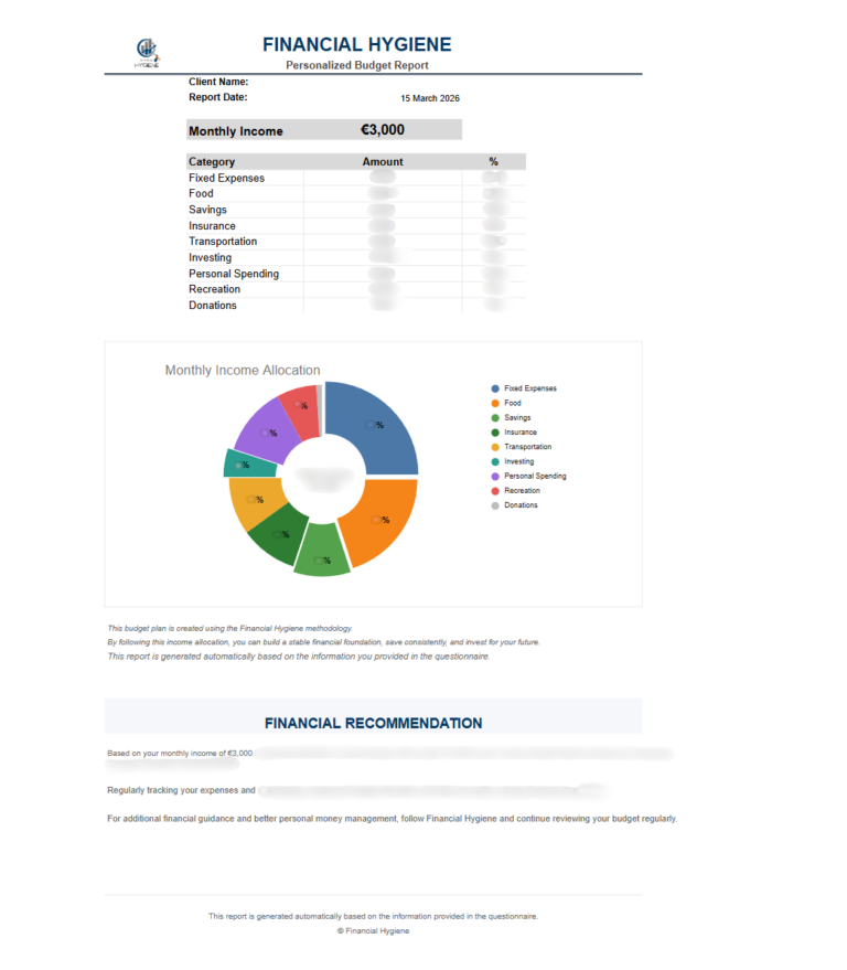 How Financial Hygiene Works The process is simple. Answer a few questions about your income and expenses and instantly receive a personalized budget report. Start the questionnaire How Your Budget Report Is Created Monthly Income Enter the amount of your monthly income. Housing Expenses How much do you pay for rent, mortgage, or household bills? Debt Payments If you have loans or other debts, include your monthly payments. Daily Expenses How much you spend on food, transportation, and personal needs. Your Email Your personalized report will be sent to this email address. Receive Your Budget Plan After payment, you will instantly receive your personalized report. Example of a budget report Ready to improve your budget? Start the questionnaire and receive a personalized financial report. Start the questionnaire